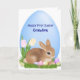Première carte de Pâques pour Grandson avec lapin, tulipes, oeufs sur le fond et oeuf bleu pâle derrière et "Happy First Easter Grandson" en violet sur le dessus. Certains artwork©delightful-doodles.com originaux