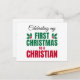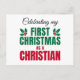 Élégant PREMIER NOËL EN CHRÉTIEN Nouveau Croyant Carte Postale de Noël avec TEXTE ET DATE PERSONNALISABLE. Le design montre la typographie en sans serif verte et rouge de Noël avec des éléments saints rouges et verts. Une grande carte postale de Noël festive à envoyer à votre famille, amis, voisins et collègues comme un nouveau croyant chrétien. Vous pouvez PERSONNALISER LE MESSAGE au contraire. Idéal comme une carte postale de Noël de l'église ou un cadeau de faveur pour les nouveaux croyants célébrant leur premier Noël chrétien. Offres assorties disponibles.