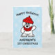 Carte de vœux personnalisée pour le premier Noël de bébé avec un ours polaire mignon, thème hiver. Conception de carte de Noël personnalisée avec un ours en peluche sur des patins à glace et des flocons de neige. Illustration d'animal drôle pour un nouveau-né garçon ou fille. Carte personnalisable avec le nom de l'enfant et vœux de Joyeuses Fêtes. Cartes uniques pour un nouveau-né ou une future maman. Créez vos propres cartes pour la première fête de Noël de votre fils, fille, petit-fils, petite-fille, petit-enfant, neveu, nièce, etc. Joyeux Noël !
