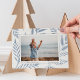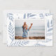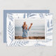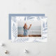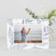 Un carte photo de vacances élégant et sobre encadre une seule photo horizontale ou orientée paysage avec une bordure blanche, sur un arrière - plan de subtils feuilles botaniques bleus poussiéreux et feuillage. Personnalisez avec votre salutation de vacances personnalisée (avec "Joyeux Noël"), votre nom de famille et l'année.