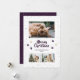 Cute purple photo Meowy Christmas card featuring three photos, snow and paw prints on the front and a snowy background at the back. Easily personalize this cute photo Christmas card with your photos, family name and the year.