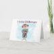 Cartes de voeux de Noël Raggedy Ann, magnets, mousepads, T-shirts, sweatshirts, et autres objets de poupée en paille avec Raggedy Ann habillé d'une robe à pois bleu tenant un bas de sucre de canne et de Noël et le texte rouge qui dit "I Love Christmas!".