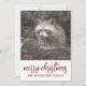 Raton laveur dans la neige hivernale, carte de Noël de vacances. Ajoutez le nom de votre famille. Style de forêts sauvages.