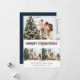 Coutume rouge et bleu Joyeux cartes photos de Noël avec un collage photo avec un titre décoratif et des lumières de Noël sur le devant et bleu arrière - plan avec la neige tombée à l'arrière. Personnalisez facilement ces cartes photos de Noël rouges et bleues avec vos images, un nom de famille et l'année.