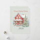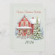 Bring the magic of the holidays to your greetings with this charming Christmas card featuring a cozy red house decorated with garlands, bows, and a beautifully lit tree covered in snow.