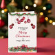 Envoyez des salutations chaudes avec cette carte de Noël élégante avec des ornements rouges festifs et des guirlandes de pin accentuées de verdure de vacances. Le message "Joyeux Noël" en gras le rend parfait pour les familles, les amis ou les salutations professionnelles. Personnalisez avec votre nom ou vos coordonnées familiales pour une touche attentive.