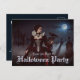 Une mystérieuse femme dans un pourpre et une robe noire se dresse au milieu de vieilles pierres tombales sous une pleine lune brillante. Dentelle, crânes et corbeau noir complètent son élégance étrange, car la brume bouillonne à travers les portes ombragées du cimetière. Invitation Halloween