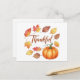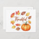Envoyez des souhaits d'automne chaleureux avec cette charmante carte postale de vacances "Thankful", avec un citrouille rustique entouré de feuilles d'automne vibrantes. Idéal pour les salutations de Thanksgiving, les messages de saison, ou simplement partager la gratitude avec des proches.