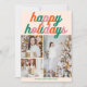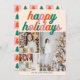 Cute retro Happy Holidays card with pretty pink and orange holiday font above your 3 favorite Christmas photos. Beautiful vertical holiday cards with a fun and colorful artistic Christmas tree pattern on the back.