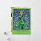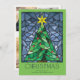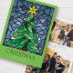 Ces cartes de voeux de Noël à plat de 5" x 7", lumineuses et colorées, sont dotées d'un vitrail d'aquarelle fait main d'un arbre de Noël vert avec une étoile d'or et des ornements rouges encadrés dans les tons bleus sur un arrière - plan vert perroquet. L'accueil est "Noël", en grandes lettres décoratives avec un message d'accueil modifiable, "Je vous souhaite la paix, l'amour et la joie cette saison des fêtes." Le dos de la carte comporte un emplacement pour trois de vos photos préférées avec des espaces réservés pour votre nom et votre année.