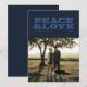 Paix et amour. Cette carte de vacances avec photo vous offre un accueil rétro, mais un message toujours pertinent. La riche palette classique de couleurs marine et bleue, les coins arrondis et le fond de texture en mauvais état lui donnent encore plus une sensation vintage.