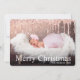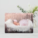 Carte de voeux Joyeux Noël personnalisée moderne avec élégante parties scintillant à goutte d'or faux rose, flocons de neige et police de calligraphie élégante. Ajoutez votre photo préférée et customisez le modèle de texte au verso.