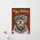 Carte de vacances avec illustration à l'aquarelle du chien Rottweiler sur un fond écossais vert et rouge festif et vœux de vacances personnalisables.