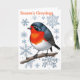 Accueillez la saison avec cette charmante carte de Noël, mettant en vedette un rouge-gorge perché sur une branche et entouré de délicats flocons de neige.