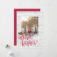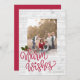 Une carte traditionnelle et rustique de vacances photo, avec un arrière - plan en bois blanc superposé avec votre photo préférée et des "souhaits chauds" en lettres rouges, avec des feuilles saints et des baies établissement. L'inverse est en solide rouge festif.