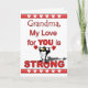 Carte de voeux de la Saint-Valentin pour une grand-mère. Un pingouin musclé lève le poids du coeur et une ombre est jetée derrière lui. Le mot STRONG a la lettre O polie en forme de coeur. Elément de pingouin grâce à HGomez/Openclipart. Copyright © Shoaff Ballanger Studios.