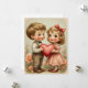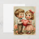 Envoyez une touche de charme nostalgique pour la Saint-Valentin avec cette carte fantaisiste inspirée des modèles anciens, mettant en vedette deux personnages adorables. Le design montre un petit garçon qui offre une boîte de chocolats en forme de cœur et une délicate petite fille tenant un bouquet de roses, le tout illustré dans des couleurs pastel atténuées pour évoquer la chaleur et l'innocence d'une époque révolue. Parfait pour tous ceux qui aiment les traditions classiques de la Saint-Valentin et la romance à l'ancienne.