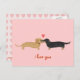 Chiens de dessin animé teckel rouge à poil court et teckel noir et feu à poil long avec cœur sur une carte postale rose. Une carte de Saint-Valentin, d'anniversaire ou d'amour adorable pour les amateurs de teckel. Le texte peut être personnalisé avec votre propre message pour n'importe quelle occasion. Impressionnez votre moitié avec une carte d'amour de petits chiens mignons. Découvrez Jenn's Doodle World pour encore plus d'art et d'illustrations de races de chiens à vendre sur des cartes de vœux et des cadeaux pour l'amoureux des chiens dans votre vie.
