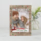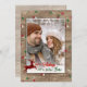 Carte de vacances unique, classique, tendance, rustique et décorative, avec Happy Holidays Joyful texte de la nouvelle année, et de la place pour customiser ou personnaliser avec une photo et les noms (ou nom de famille) de votre choix sur un rustique chalet de campagne style patiné ferme grange planches de bois texture motif, et festif classique rouge et vert et confetti dispersé de couleur rouge et vert. Et une saison personnalisable saluant poème sur le dos de la carte.