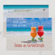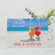 Salutations des Mers carte de vœux de Noël de plage tropicale. Des cocktails glacés s'assoient sur une plage de sable dans ce design. Envoyez depuis un climat chaud. Personnalisez avec le vœu de votre choix.