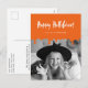 Carte postale éffrayante Halloween avec "Happy Halloween" en lettres blanches. Le haut du design présente du sang orange moucheté coulant sur votre photo ci-dessous. Personnalisez le devant de la sanglante carte postale Halloween avec votre nom. Le dos de la carte postale contient votre adresse de retour et votre message personnalisé.