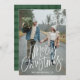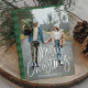 Carte de vacances tendance et moderne avec votre photo verticale à fond de sang sur le devant avec "Joyeux Noël" dans une superposition de script blanc et écrit à la main. Personnalisez l'avant de la simple carte de vacances en ajoutant votre nom et l'année. La carte de vacances revient pour présenter un arrière - plan plaid vert peint avec espace pour des photos et du texte supplémentaires.