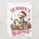 A festive and cheerful Christmas holiday design showcases a skeleton wearing a Santa hat, reading a book, and holding a steaming cup of coffee. Surrounding him are poinsettias, holly berries, and pine tree branches. The colorful text says: "Season's Readings." This design is available on a variety of products, making it the perfect gift for book lovers.