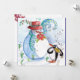 Peinture originale fantaisiste et colorée au pastel dans des tons bleus, blancs et rouges, bonhomme de neige et manchot jouant du violon dans la neige hivernale avec des fleurs rouges, fioritures. par Bulgan Lumini (c)