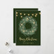 Ces cartes de Noël branchées et élégantes sont ornées d'une jolie couronne de Noël aquarelle aux accents d'étoiles dorées et d'élégantes lampes à cordes, avec une calligraphie de script moderne sur un arrière - plan vert de forêt.