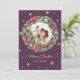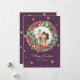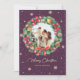Carte de Noël avec photo violet personnalisée avec une photo à l'intérieur d'une couronne d'aquarelle de baies, de houx, de cônes de pin, de branches de conifères et de fleurs poinsettia sur un arrière - plan violet avec un titre de police en écriture manuscrite or, flocons de neige et chute de neige. Personnalisez facilement cette carte de Noël aquarelle avec votre image, un nom de famille et un texte. Les couleurs arrière - plans peuvent être changées en n'importe quelle couleur.
