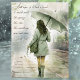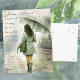 Carte postale d'inspiration printanière illustrant une aquarelle d'une femme marchant sur un chemin pavé par un jour de pluie. Elle est vue de derrière, portant un manteau de couleur claire, des bottes au genou et portant un sac sur son épaule. Elle tient un parapluie au-dessus de sa tête, se protégeant de la pluie. L'arrière - plan est brumeux et flou, verdure et murs en pierre sont visibles le long du chemin. Une citation de l'auteur Jennifer Rush - "Et j'espère, si elle avait un parfum, elle sentirait comme le printemps, comme la pluie, comme quelque chose de nouveau et vivant." à gauche de l'illustration en couleur pour correspondre à l'illustration. Une esthétique douce avec une palette de couleurs de vert muet, gris et de tons de terre, créant une atmosphère réfléchissante.