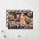 Partagez des salutations saisonnières chaleureuses avec ce carte photo d'Halloween mignon avec "Happy Halloween" dans une superposition manuscrite blanche. Customisez le design avec votre photo horizontale préférée et votre nom de famille en texte blanc assorti pour une touche personnelle. Le revers présente un motif plaid crème et noir aquarelle, ajoutant un charme d'automne douillet à votre correspondance de éffrayante saison. Parfait pour envoyer à des amis, à des familles et à des proches.