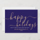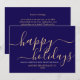 Simple carte de séjour d'affaires bleu minimaliste avec un élégant script moderne lisant "Happy Holidays" dans une belle couleur or. Cette carte est entièrement personnalisable. Vous pouvez modifier n'importe quel message avec celui de votre choix. Offrez de la joie et de la chaleur à vos collègues et clients grâce à notre carte magnifiquement conçue. Joyeuses fêtes !