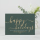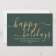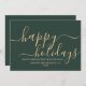 Simple carte de vacances minimaliste verte avec un élégant script moderne lisant "Happy Holidays" dans une belle couleur or. Cette carte est entièrement personnalisable. Vous pouvez modifier n'importe quel message avec celui de votre choix. Offrez de la joie et de la chaleur à vos collègues et clients grâce à notre carte magnifiquement conçue. Joyeuses fêtes !