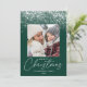 Carte de vacances unique et moderne avec des flocons de neige en chute blanche au sommet du design avec un arrière - plan vert d'épinette festif. Votre photo carré est affichée au milieu du design avec le message de bienvenue "Joyeux Noël", dans un script de calligraphie blanc tendance montré ci-dessous. Personnalisez l'avant de la carte de vacances Flambeau de neige en ajoutant votre nom et l'année. La carte inverse pour afficher une photo supplémentaire avec votre message personnel en lettres blanches modernes.