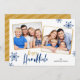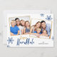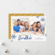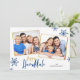 Ce carte photo Hanoukka offre un design simple avec 2 photos et l'accueil "Happy Hanoukka" apparaissant en bleu foncé et or. L'arrière - plan est agrémenté de flocons de neige bleu foncé.