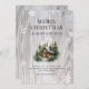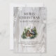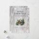 Aquarelle Joyeuse carte de Noël avec un cabine en rondins dans les bois contre un arrière - plan en bois rustique orné de flocons de neige. Personnalisez facilement cette carte de vacances avec votre nom de famille et votre texte.