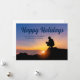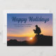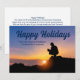 Un ouvrier du bâtiment est accroupi devant un magnifique coucher de soleil sur cette charmante carte de Joyeuses Fêtes. Une carte de Noël personnalisée et mignonne pour une entreprise de construction ou un constructeur de maisons.