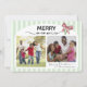 Cette carte de Noël horizontale présente un design joyeux et chaleureux encadré dans une bordure rayée vert clair et orné d'un nœud rouge et vert. En haut, la phrase « MERRY memories » est bien visible, mélangeant une police grasse et festive avec une écriture élégante. Un nœud en ruban rouge et vert ajoute une touche de gaieté festive dans le coin supérieur droit. La carte offre de la place pour 2 photos et un texte personnalisé au verso pour un message personnel. Le design transmet avec élégance la chaleur, la connexion et la célébration, ce qui en fait une belle salutation de vacances.