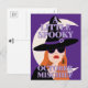 Lighthearted, mischievous, Halloween postcard has a typography design with playful wording "A Little Spooky October Mischief" with a modern and fashionable red headed witch and a crescent moon on a purple background.