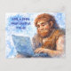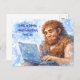 A humorous watercolor postcard featuring a friendly Neanderthal using a laptop, blending prehistoric charm with modern life. Perfect for science lovers, anthropology fans, geeks, and anyone who enjoys clever humor. A fun card for Neanderthal Day, birthdays, or just to make someone smile.