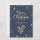 Calligraphie Bleue Joyeuse carte de Noël avec flocons de neige, sucres de canne de Noël, baies sainte et rouge sur un arrière - plan plaid de buffle bleu.