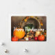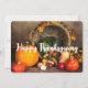 Une carte plate avec une photographie d'une récolte de Thanksgiving, posée sur une table en bois rustique. Citrouille, pommes de terre, courge, etc... composent cette collection abondante de nourriture. Des feuilles d'automne colorées entourent le panier corne d'abondance.