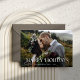 Ces cartes de Noël élégantes et minimalistes présentent une typographie blanche élégante et élégante, comme une superposition qui dit "Joyeuses fêtes". Votre photo de famille ou de couple préférée se trouve à l'avant de la carte, et il y a de la place pour deux autres à l'arrière. Vous pouvez également ajouter un message de vacances personnalisé à l'arrière.