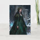The Holly Queen wears a green gown decorated with holly, and a crown made of holly, as she sgtands outside her castle in winter. Beautiful Gothic image, perfect for anyone who loves fantasy, on this holiday card.