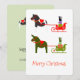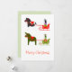Sonnez les cloches! Nous voici, sur notre chemin vers les festivités! Jolie carte de vacances fantaisiste avec un cheval dala pinto, une mule et des chats faisant une balade en traîneau rempli de cadeaux. Beaux coloris en rouge vert et blanc