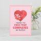 Vous êtes le morceau qui complète mon puzzle**carte de la Saint-Valentin comporte un beau puzzle en forme de cœur, symbolisant l'ajustement parfait entre vous et votre bien-aimé. Les pièces de puzzle vibrantes aux couleurs de la Saint-Valentin et le message sincère "Tu es la pièce qui complète mon puzzle" en font un moyen idéal d'exprimer votre amour. Parfait pour les anniversaires, la Saint-Valentin ou toute occasion de montrer à quelqu'un de spécial à quel point il compte pour vous.