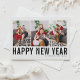 Bonne année ! Personnalisable Happy New Year photo collage carte plat avec typographie simple noire et motif de neige. Personnalisez en ajoutant trois photos, noms, année et autres détails. Cette carte à plat moderne du Nouvel An est disponible en d'autres couleurs et en carton.