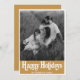 Rendez vos vœux de vacances inoubliables avec notre carte de vœux Joyeuses Fêtes avec photo et typographie rétro tendance en or. Cette carte élégante combine un minimalisme moderne avec une touche de charme vintage, mettant en vedette un design doré saisissant qui complète une photo de famille en noir et blanc précieuse. La typographie propre et audacieuse capture l'essence du style contemporain tout en conservant une atmosphère de fête classique, rendant votre message "Joyeuses Fêtes" à la fois élégant et marquant.