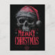 design graphique audacieux et grincheux, avec un crâne très détaillé et dessiné à la main, couronné d'un chapeau de Père Noël rouge en détresse. L'illustration a un aspect lourd, texturé et légèrement taché, dressé contre un arrière - plan gris foncé. Sous le crâne, les mots "MERRY CHRISTMAS" sont présentés dans une proéminente typographie rouge stylisée. Ce design offre une alternative unique pour la saison des fêtes.